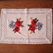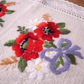 真っ赤な大輪のお花、白いお花などの手刺繍がほどこされたテーブルマットです。