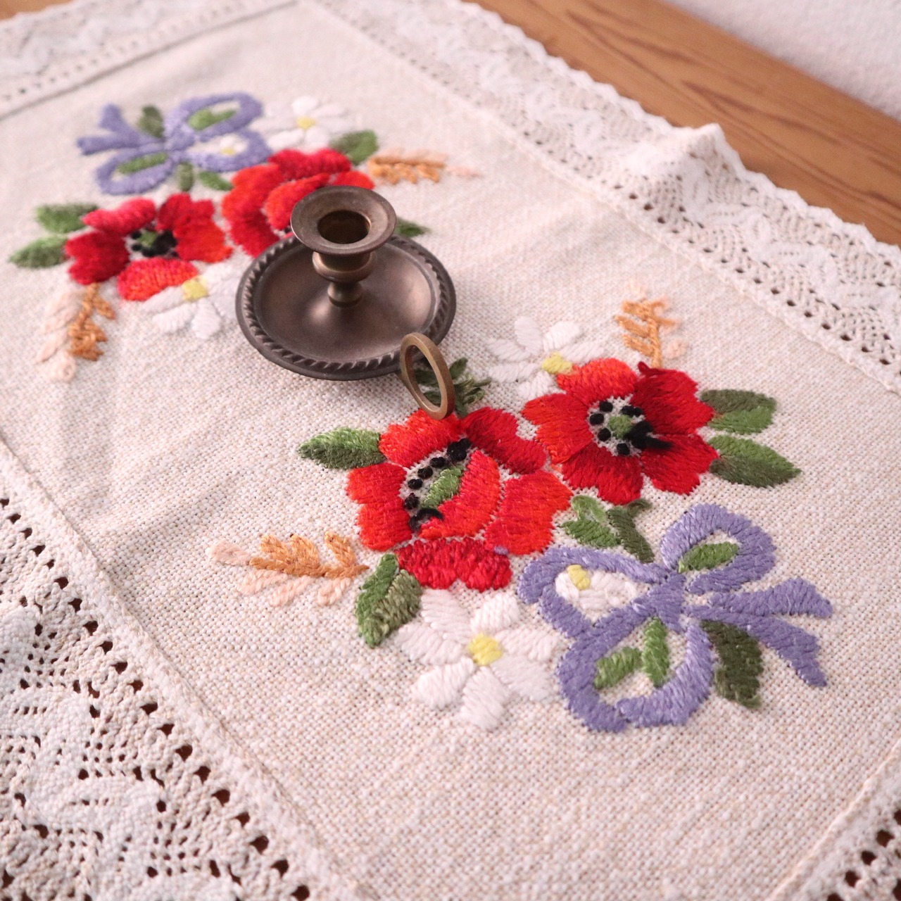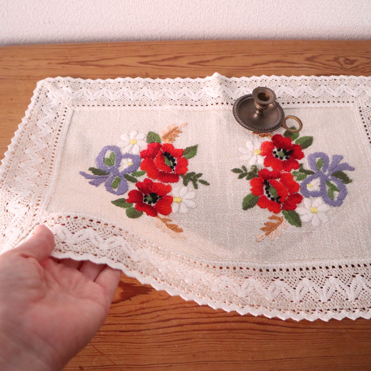 赤や白のお花の手刺繍 テーブルマット 未使用品 /ヴィンテージ・ドイツ(A)
