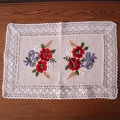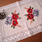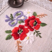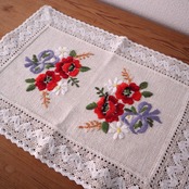 真っ赤な大輪のお花、白いお花などの手刺繍がほどこされたテーブルマットです。