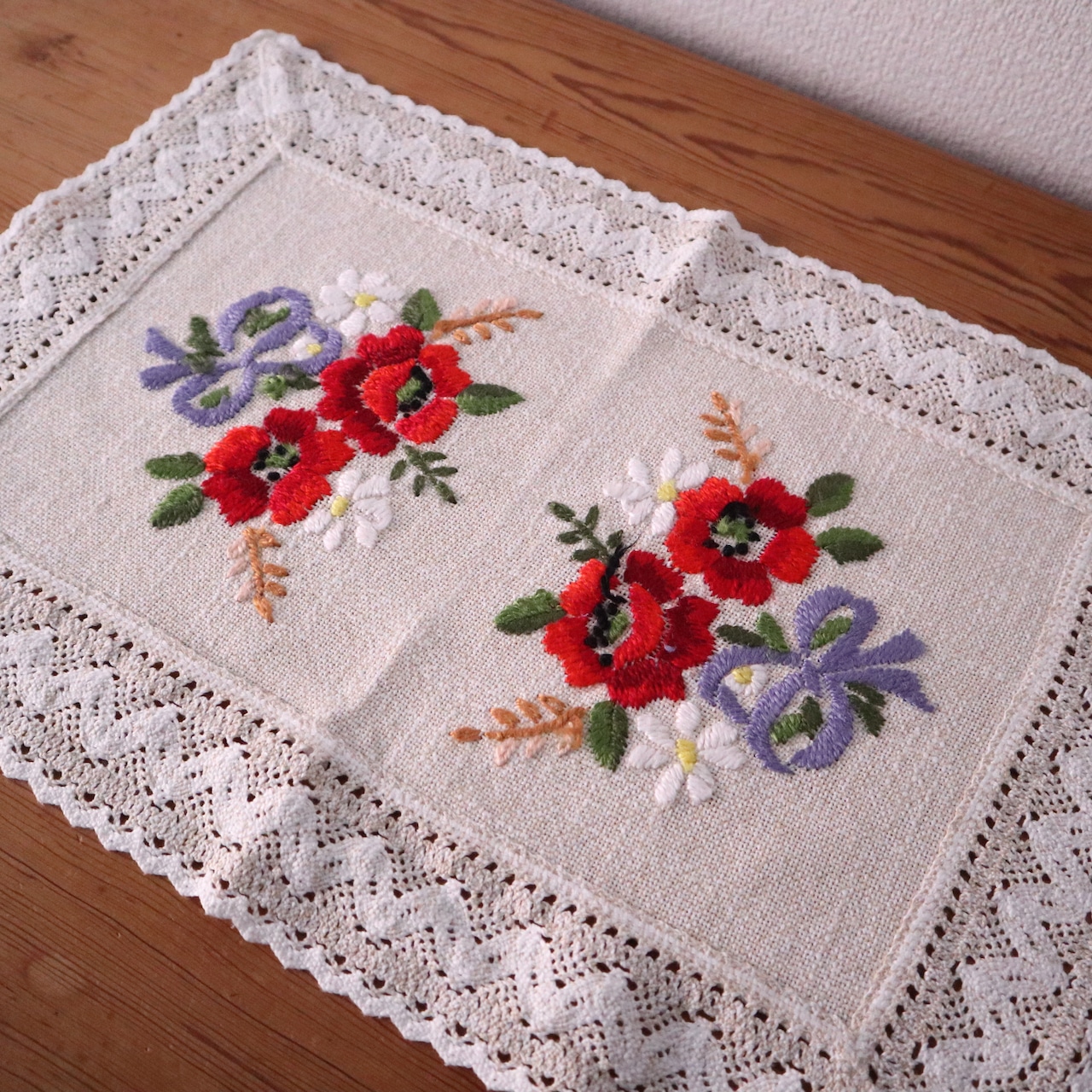 赤や白のお花の手刺繍 テーブルマット 未使用品 /ヴィンテージ・ドイツ(B)