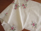 すてきなピンクのバラがメインで、そのまわりにはブルーや黄色の小花の手刺繍がほどこされたテーブルクロスのご紹介です。