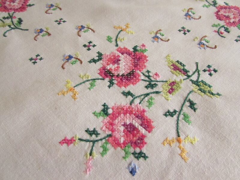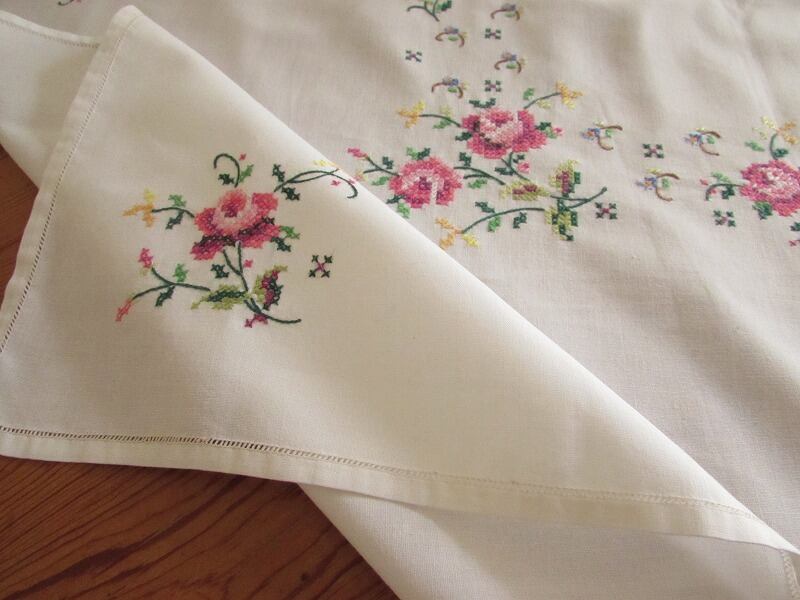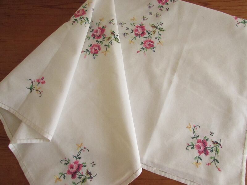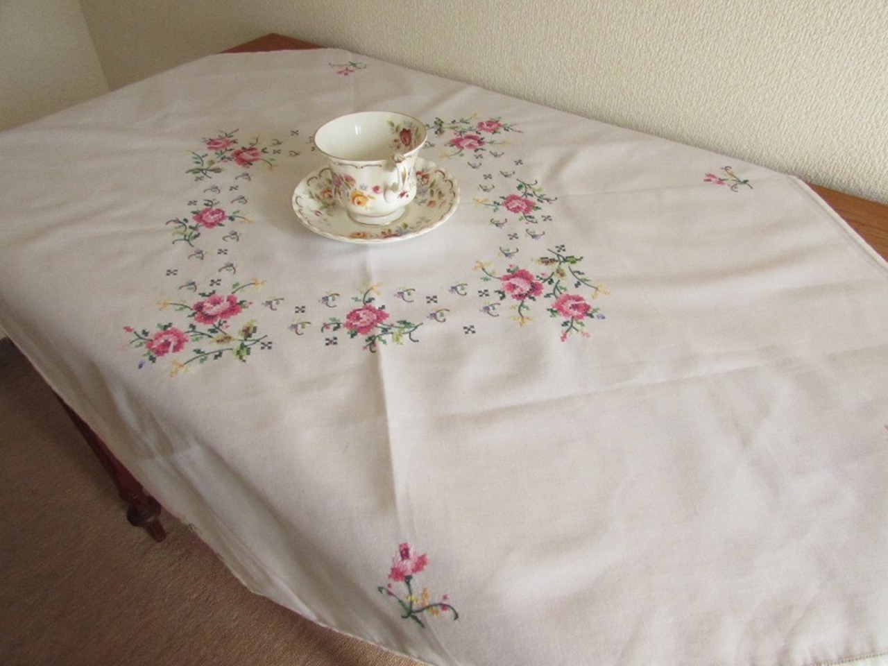 【古典的な薔薇ワールド】素敵なピンクのバラのクロスステッチ 手刺繍テーブルクロス /ヴィンテージ・ドイツ