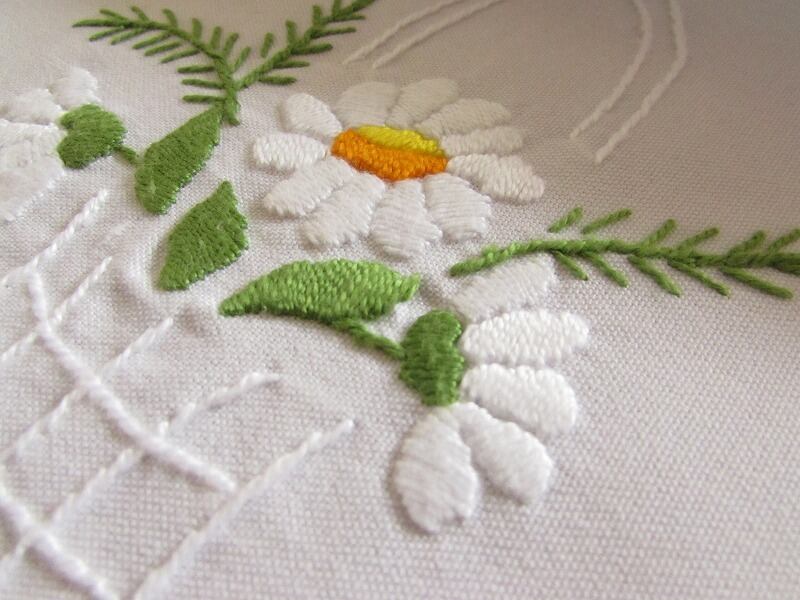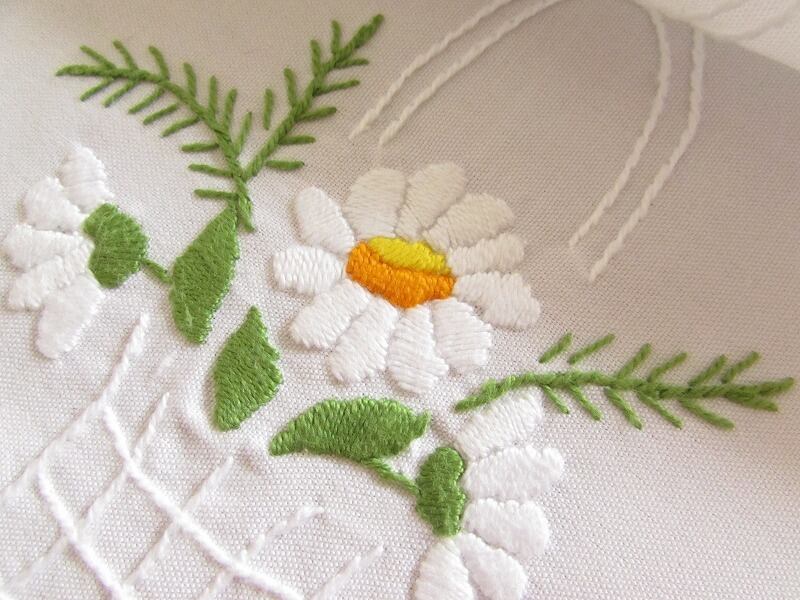 白いバスケットに活けられた可愛い白いお花の手刺繍入り テーブルマットです。