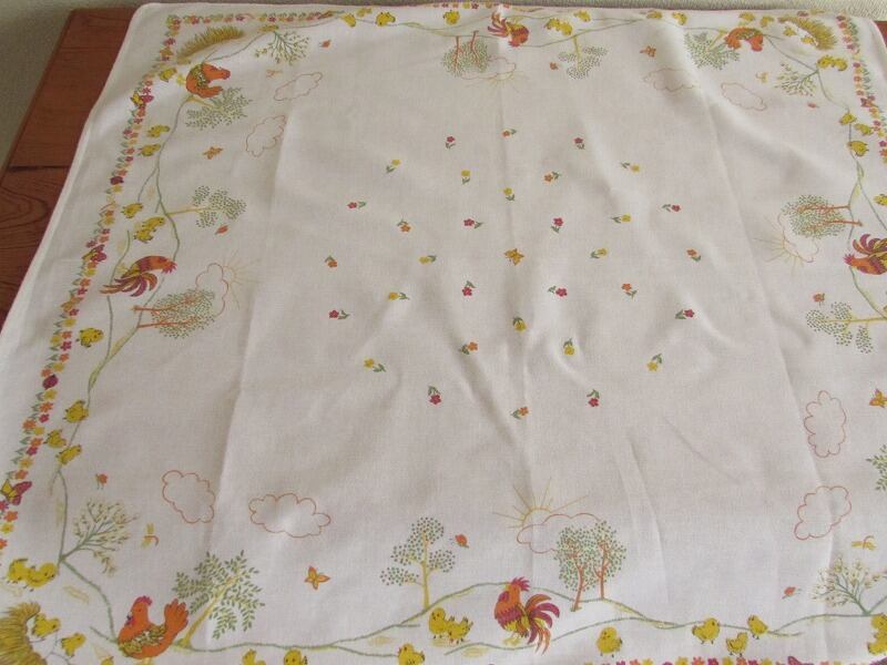 【ひよこ達のお散歩】野原で遊ぶひよこ・にわとりのプリント柄 テーブルクロス /ヴィンテージ・ドイツ