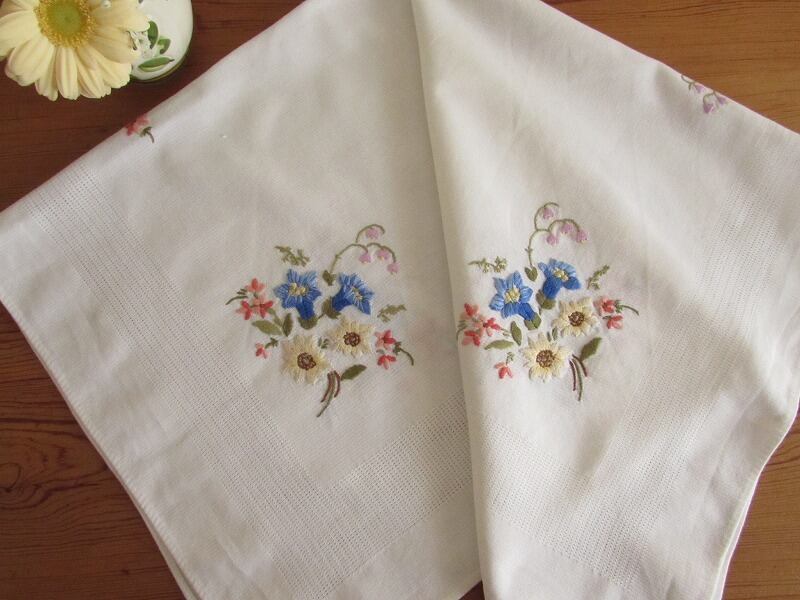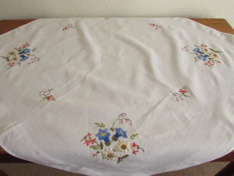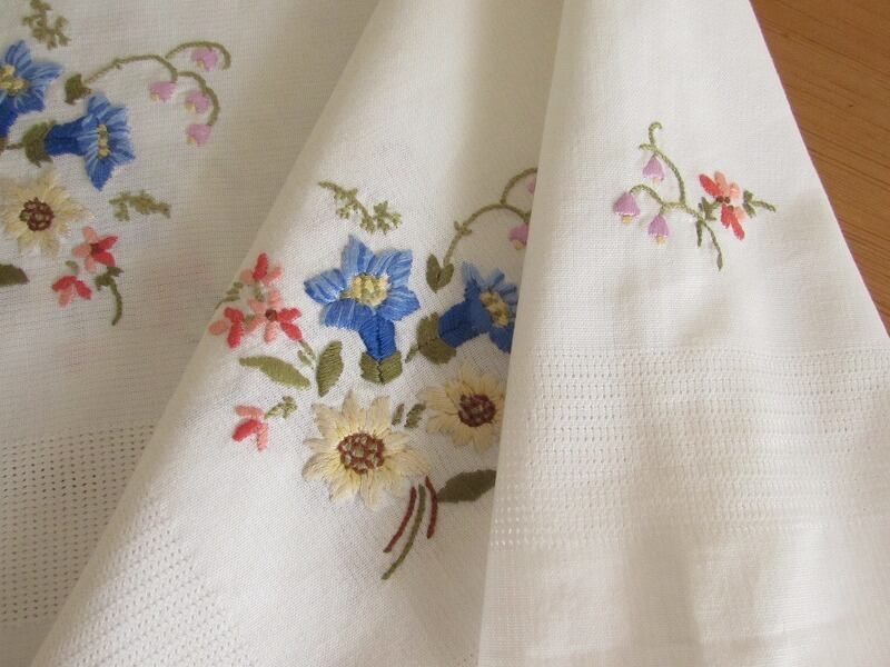 【高山植物の世界】リンドウやエーデルワイス お花の手刺繍 テーブルクロス /ヴィンテージ・ドイツ