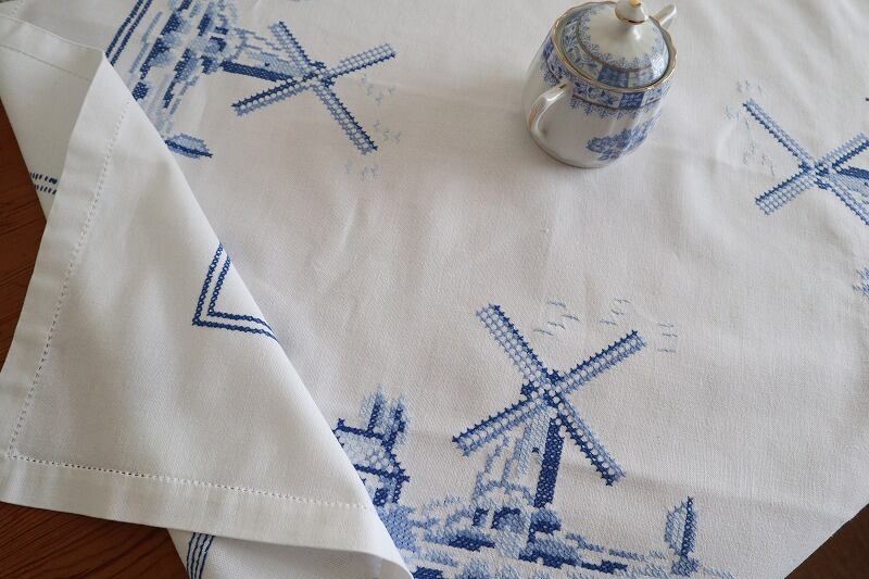 風車小屋のある景色の手刺繍がほどこされた素敵なテーブルクロスのご紹介です。