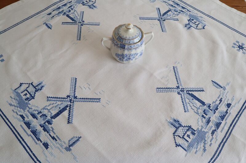【青の風車小屋】風車小屋の青糸手刺繍 テーブルクロス /ヴィンテージ・ドイツ
