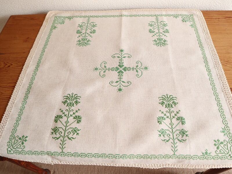 【グリーンの世界】無漂白生地に緑色の手刺繍と手編みレース 小ぶりなテーブルクロス /ヴィンテージ・ドイツ