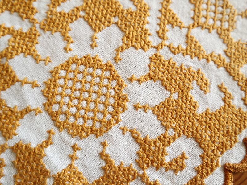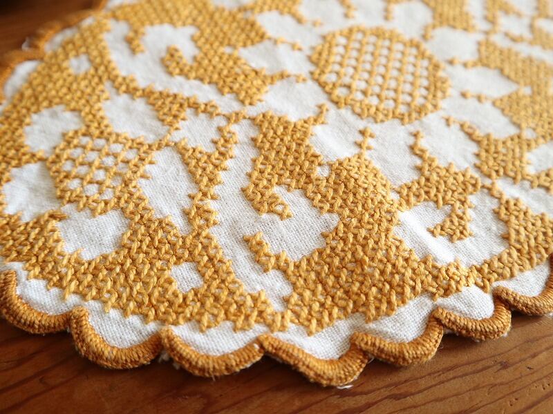 【お花のドイリー】マスタードイエローの糸で白抜きお花の手刺繍 ドイリー /ヴィンテージ・ドイツ フォークロア