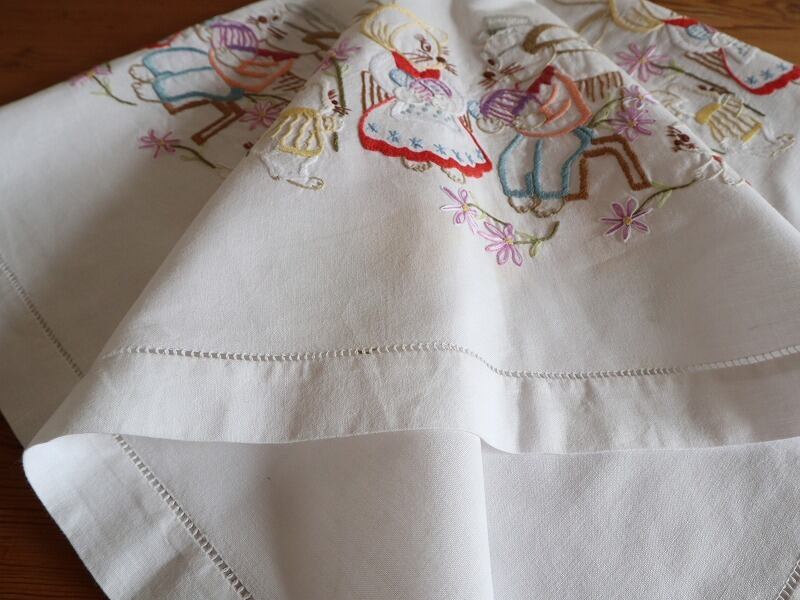 可愛らしいうさぎやお花の手刺繍がほどこされたテーブルクロスです。