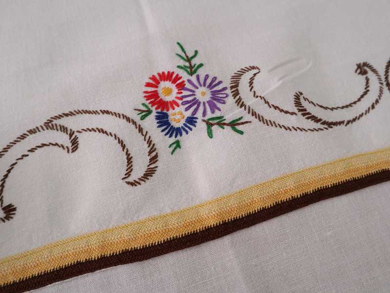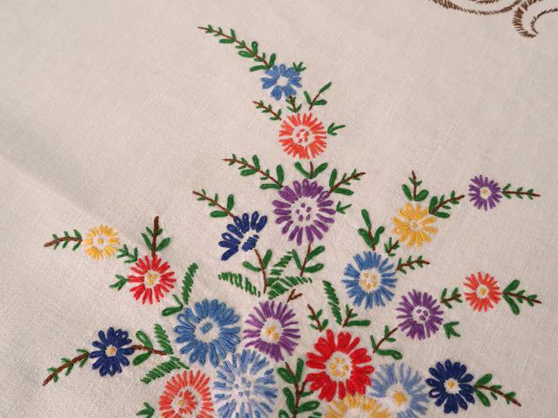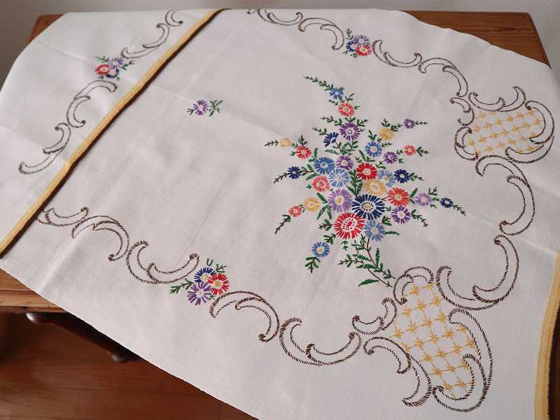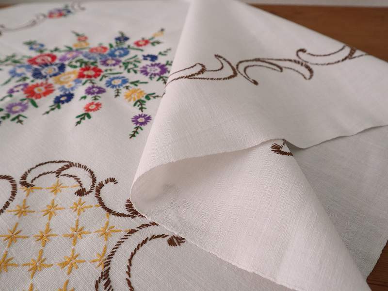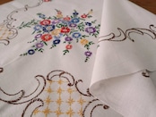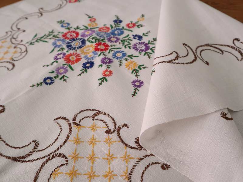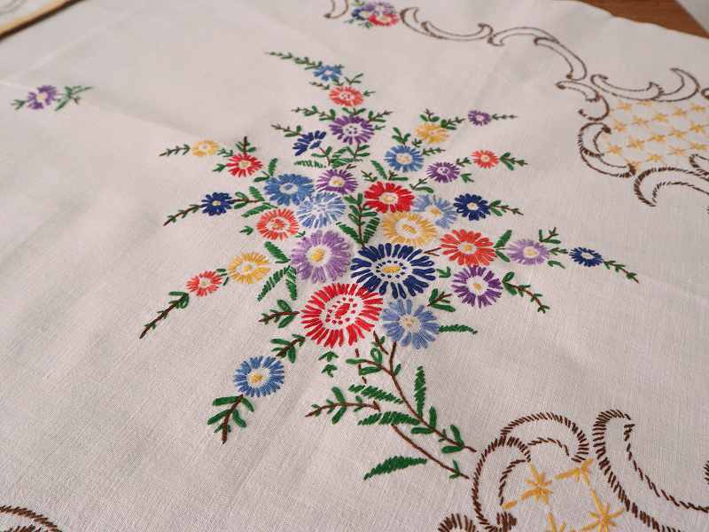 【カラフルフラワー】色とりどりの小花の手刺繍 オーバータオル・カーテン/ヴィンテージ・ドイツ (タペストリー パネル)